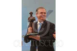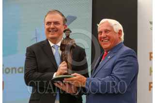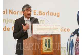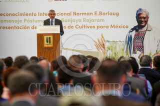 METEPEC, ESTADO DE MÉXICO, 28ABRIL2022.- Durante la Ceremonia Agricultura para La Paz Sanjaya Rajaram del Centro Internacional de Mejoramiento de Maíz y Trigo (CIMMYT), Marcelo Ebrard Casaubón, Secretario de Relaciones Exteriores recibió el reconocimiento Internacional Norman E. Borlaug; acompañado por Víctor Villalobos, Secretario de Agricultura y Pankaj Sharma, Embajador de la India en México. FOTO: CRISANTA ESPINOSA AGUILAR /CUARTOSCURO.COM