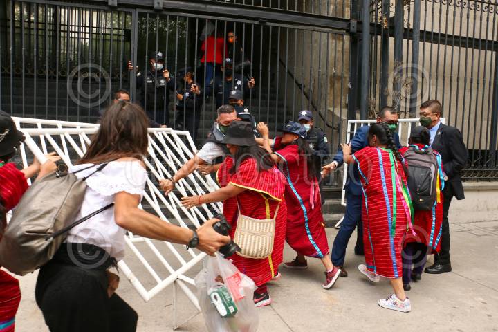 CIUDAD DE MÉXICO, 29ABRIL2021.- Mujeres triquis desplazadas por la violencia que se vive en Tierra Blanca Copala, Oaxaca, realizaron un bloqueo sobre la avenida Bucareli para posteriormente intentar ingresar a la Secretaría de Gobernación en busca de entablar una mesa de diálogo con Alejandro Encinas Alejandro Encinas, subsecretario de Derechos Humanos de Segob. FOTO: ROGELIO MORALES /CUARTOSCURO.COM