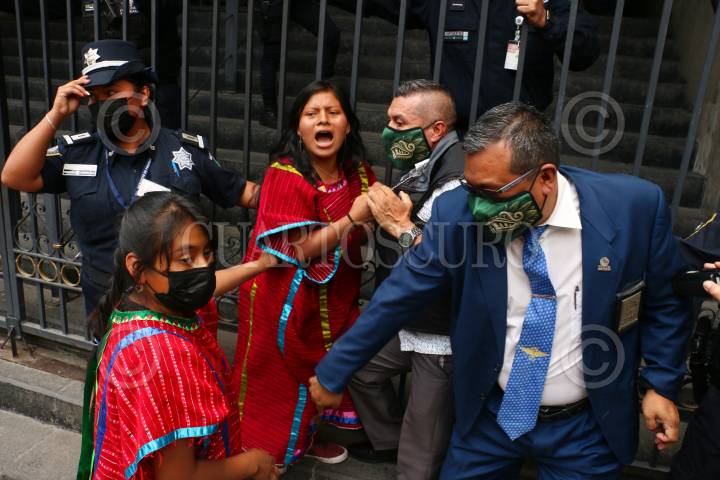 CIUDAD DE MÉXICO, 29ABRIL2021.- Mujeres triquis desplazadas por la violencia que se vive en Tierra Blanca Copala, Oaxaca, realizaron un bloqueo sobre la avenida Bucareli para posteriormente intentar ingresar a la Secretaría de Gobernación en busca de entablar una mesa de diálogo con Alejandro Encinas Alejandro Encinas, subsecretario de Derechos Humanos de Segob. FOTO: ROGELIO MORALES /CUARTOSCURO.COM