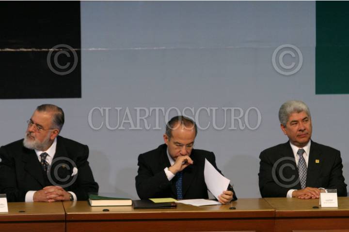 MEXICO, D.F. 13DICIEMBRE2006.- Jose Luis Soberanes, presidente de la Comisión Nacional de Derechos Humanos, el presidente Felipe Calderón Hinojosa y Francisco Ramírez Acuña, secretario de gobernación durante la ceremonia de entrega del premio Nacional de Derechos Humanos 2006 en la residencia oficial de los Pinos. FOTO: NELLY SALAS/CUARTOSCURO.COM