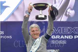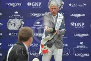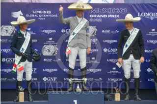 CIUDAD DE MÉXICO, 30ABRIL2022.- Ceremonia de premiación del circuito hípico "Longines Global Champions Tour Gran Premio de México 2022" realizado en el Campo Militar Marte. Primer lugar: Ludger Beerbaum (Alemania); Segundo lugar: Denis Lynch (Irlanda); Tercer lugar: Michael Duffy (Irlanda). FOTO: MARIO JASSO/CUARTOSCURO. COM