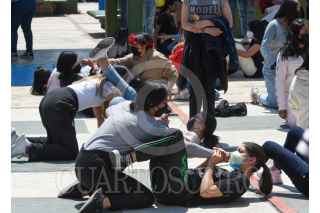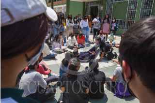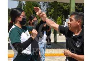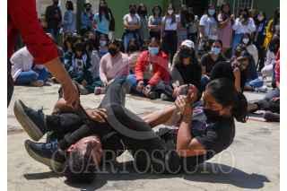 TOLUCA, ESTADO DE MÉXICO, 02MAYO2022.- Estudiantes mujeres del Plantel “Lic. Adolfo López Mateos” Prepa 1 de la UAEM tomaron el Taller de Defensa Personal para Mujeres impartido por la Federación Mexicana de Criminología y Criminalística, ante la problemática de violencia contra las mujeres y las estudiantes sepan cómo reaccionar ante determinadas eventualidades; durante una hora con cuarenta minutos las estudiantes recibieron en el taller técnicas de defensa personal y cómo actuar ante un posible secuestró, violación, tocamientos. El taller se dio de forma gratuita y ante la aceptación por parte de las estudiantes no se descarta tener otra clase y abierto a otras preparatorias. FOTO: CRISANTA ESPINOSA AGUILAR /CUARTOSCURO.COM