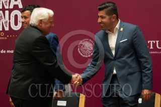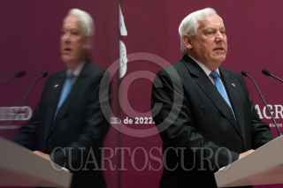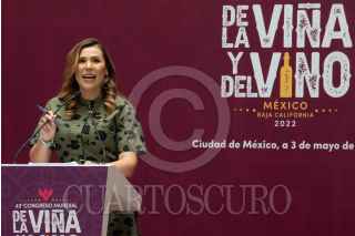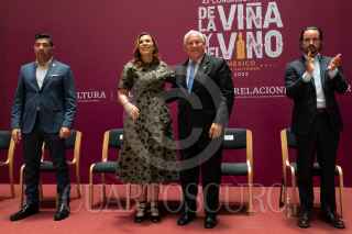 CIUDAD DE MÉXICO, 03MAYO2022.- Víctor Villalobos, secretario de Agricultura y Desarrollo Rural; Armando Ayala, presidente municipal de Encenada; Marina del Pila Ávila, gobernadora de Baja California, y Hans Backhoff, presidente del Consejo Mexicano Vitivinícola, encabezaron una conferencia de prensa en la que anunciaron el 43 Congreso Mundial de Viña y Vino que se llevará a cabo del 31 de octubre al 4 de noviembre en el estado de Baja California. El acto se realizó en las inmediaciones de la Secretaria de Agricultura. FOTO: GRACIELA LÓPEZ /CUARTOSCURO.COM