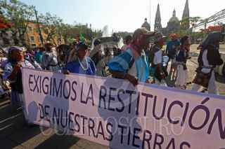 GUADALAJARA, JALISCO, 06MAYO2021.- Alrededor de 200 indígenas y después de 353 Kilómetros de recorrido y 11 días de caminata, llego al centro de la ciudad “La Caravana de la Dignidad y la Conciencia Wixárika” integrada por autoridades tradicionales y agrarias de San Sebastián Teponahuaxtlán y Tuxpan de Bolaños. La intención es caminar hasta Palacio nacional para reunirse con el Presidente de la Republica, Andrés Manuel López Obrador y poder hacerle la petición de la restitución de 11,000 hectáreas de la zona Huajini, que lleva casi 50 años de litigio sin solución, misma que actualmente posen ganaderos de Nayarit, pese a que anteriormente se resolvió a favor de las comunidades indígenas. FOTO: FERNANDO CARRANZA GARCIA / CUARTOSCURO.COM