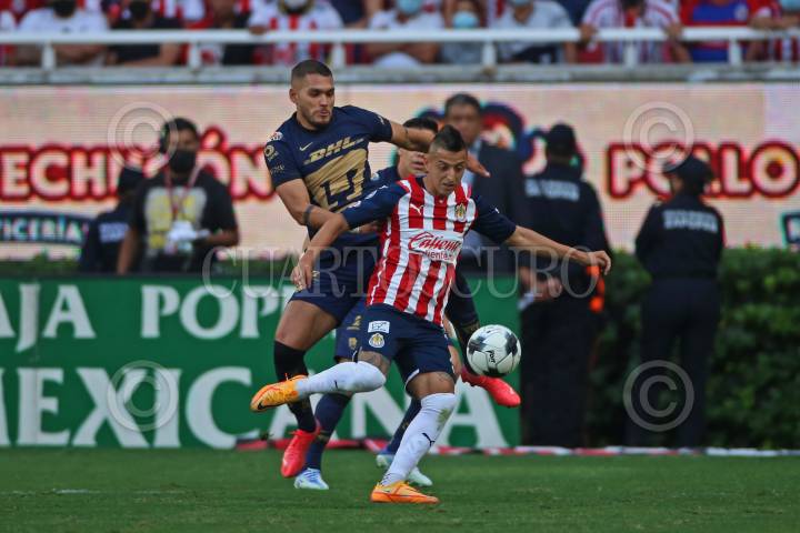 ZAPOPAN, JALISCO, 08MAYO2022.- Esta tarde en el Estadio Akron se lleva a cabo el juego entre las Chivas de Guadalajara frente al conjunto de Pumas de la UNAM, esto en partido correspondiente a la reclasificación del Torneo Grita México Clausura 2022 de la Liga MX, el marcador al final es de 4-1 a favor del equipo de casa. FOTO: FERNANDO CARRANZA GARCIA / CUARTOSCURO.COM