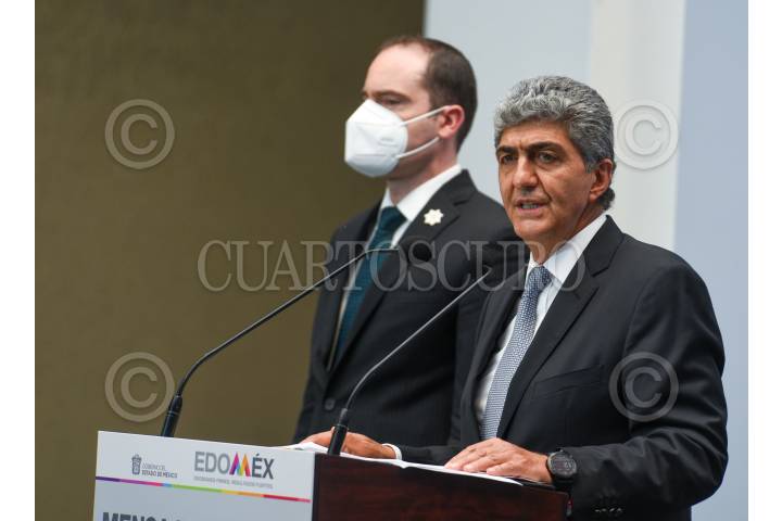 TOLUCA, ESTADO DE MÉXICO, 09MAYO2022.- Ernesto Nemer Álvarez Secretario General de Gobierno, acompañado por Rodrigo Martínez-Celis Wogau, Secretario de Seguridad y Rodrigo Archundia Barrientos Vicefiscal General de la FGJEM, en conferencia de prensa se informó que después del ataque sufrido en el Centro de Justicia de Sultepec el pasado 3 de mayo, la Secretaría de la Defensa enviara alrededor de 300 efectivos para blindar las fronteras de la entidad mexiquense con los estados de Michoacán y Guerrero. FOTO: CRISANTA ESPINOSA AGUILAR /CUARTOSCURO.COM