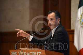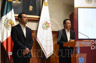 XALAPA, VERACURZ, 09MAYO2022.- El gobernador de Veracruz, Cuitláhuac García Jiménez, dijo que tres lagunas del estado tienen problemas “graves” que las ponen en riesgo de desaparecer. En conferencia en Palacio de Gobierno, detalló que se trata de El Farallón, la Laguna de San Julián y Laguna Verde. Lo acompañó el secretario de Finanzas, José Luis Lima Franco. FOTO: YERANIA ROLÓN/CUARTOSCURO.COM