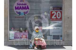 TOLUCA, ESTADO DE MÉXICO, 10MAYO2022.- No todas las mamás celebran este día, algunas de ellas salen a la calle a buscar algunas monedas para poder comer algo en el día, tal es el caso de esta mujer de edad avanzada, sentada frente a un aparador en donde ofrecen diversos regalos para las mamás. FOTO: CRISANTA ESPINOSA AGUILAR /CUARTOSCURO.COM