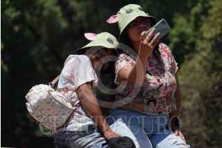 CIUDAD DE MÉXICO, 14MAYO2022.- Con sombreros de Yoda, una pareja de enamorados se toma una selfie frente al lago del Bosque de Chapultepec. FOTO: GRACIELA LÓPEZ /CUARTOSCURO.COM