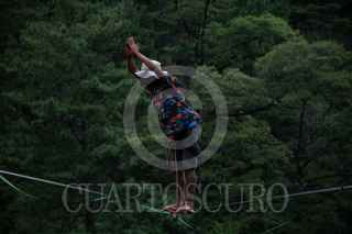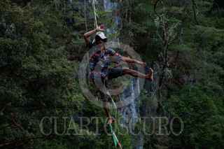 SAN CRISTÓBAL DE LAS CASAS, CHIAPAS, 15MAYO2021.- En el parque ecoturístico El Arcotete, Juan Manuel Hernandez originario de Argentina realizó su primer cruce desde las alturas en la cuerda floja, más de 100 metros recorrió a una altura de más de 30 m. Al finalizar el acto Juan Manuel se lanzó desde las alturas y quedó suspendido en el aire por unos minutos. FOTO: ISABEL MATEOS /CUARTOSCURO.COM