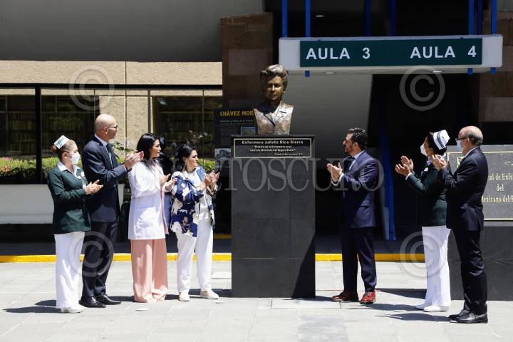 CIUDAD DE MÉXICO, 16MAYO2022.- El director general del Instituto Mexicano del Seguro Social (IMSS), Zoé Robledo, aseguró que el personal de Enfermería “son el corazón de la atención en el IMSS” y agentes de cambio en la promoción, protección y prevención de la salud para transitar hacia un nuevo modelo de atención integral. En el marco de la Ceremonia Institucional del Día de la Enfermería, se develó en la Explanada de los Jaguares, en el Centro Médico Nacional (CMN) Siglo XXI, el busto de la enfermera Julieta Rico Sierra, pionera de esta profesión en el Instituto. Durante esta celebración se entregó el Premio Dr. Jesús Kumate Rodríguez a la enfermera María Isabel López López, de la Coordinación Técnica de Enfermería del Régimen Ordinario; y al enfermero Saúl Ramón Quezada Hernández, del Hospital San Juanito, Chihuahua, de IMSS-BIENESTAR. También se otorgaron reconocimientos al Mérito de Enfermería, y del Programa a la Atención de Calidad del Personal de enfermería de base y confianza. Acudieron a este acto la Maestra Fabiana Maribel Zepeda Arias, titular de la Coordinación Técnica de Programas de Enfermería; la doctora Célida Duque Molina, directora de Prestaciones Médicas; el doctor Arturo Olivares Cerda, Secretario General del Sindicato Nacional de Trabajadores del Seguro Social (SNTSS), entre otros. FOTOS: IMSS/CUARTOSCURO.COM