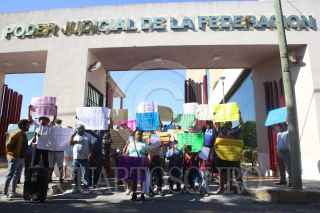 MÉRIDA, YUCATÁN, 17MAYO2022.- Hoy por la mañana un grupo de habitantes de la comisaría de Sitilpech, perteneciente al municipio de Izamal, protestaron frente a la sede del Poder Judicial de la Federación exigiendo al Juez Primero de Distrito que conceda la suspensión definitiva de la granja Kancabchén II vinculada con el Grupo Porcícola Mexicano mejor conocido como Kekén. Esta Granja se encuentra instalada a menos de un kilómetro de distancia de dicha población y de acuerdo a los manifestantes, esto ocasiona que el agua se contamine con el excremento de los cochinos, lo que ocasiona que las niñas y los niños se enfermen constantemente. FOTO: MARTIN ZETINA /CUARTOSCURO.COM