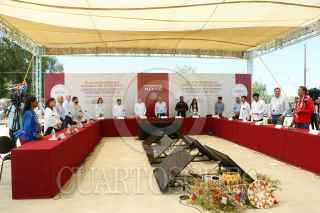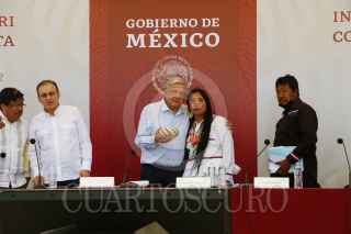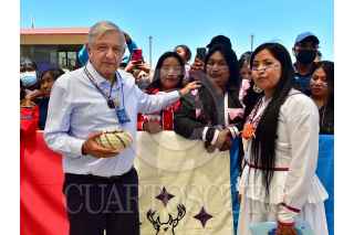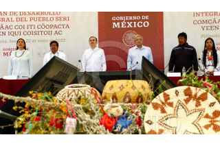 PITIQUITO, SONORA, 22MAYO2022.- Andrés Manuel López Obrador, Presidente de México, encabezó el Plan de Desarrollo Integral del Pueblo Seri en Escuela Primaria Indígena “Guadalupe Victoria”. Lo acompañaron: Alfonso Durazo Montaño, Gobernador del Estado de Sonora; Adelfo Regino Montes, Director General del Instituto Nacional de los Pueblos Indígenas; Joel Bernett Morales, Gobernador Tradicional del Pueblo Seri; Enrique Robles Bernett, Presidente del Consejo de Ancianos Comca´ac (Punta Chueca y Desemboque) y María Luisa Astorga Flores, integrante del Consejo de Ancianos Comca´ac (Punta Chueca y Desemboque). FOTO: PRESIDENCIA/CUARTOSCURO.COM