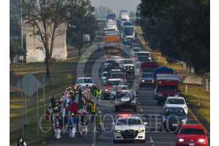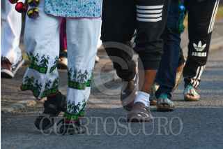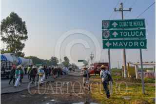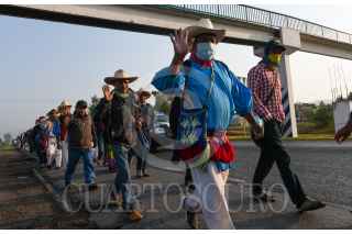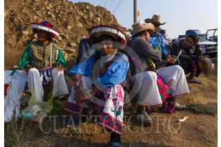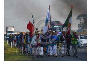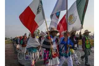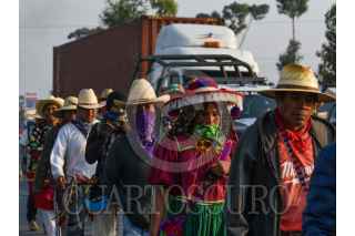 TOLUCA, ESTADO DE MÉXICO, 23MAYO2022.- Integrantes de la comunidad wixárika de San Sebastián Tepenahuaxtla, Jalisco, quienes salieron con dirección a la CDMX con la Caravana de la Dignidad y la Conciencia Wixárika el pasado 25 de abril pidiendo la intervención del presidente Andrés Manuel López Obrador en el conflicto agrario que tienen desde hace 60 años y se garantice la restitución de 11 mil hectáreas de su territorio invadido por ganaderos y talamontes, el domingo ingresaron al Estado de México y pernoctaron en Atlacomulco, este lunes retomaron su camino a las 5 de la mañana y llegarán al municipio de Ixtlahuca en donde pasarán la noche y mañana martes llegarán a la capital mexiquense. FOTO: CRISANTA ESPINOSA AGUILAR /CUARTOSCURO.COM