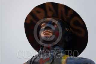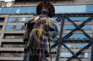 CIUDAD DE MÉXICO, 24MAYO2022.- La escultura del Sereno de la Glorieta de Insurgentes, que conmemora la seguridad pública de la ciudad, se encuentra intervenido con pintura y la leyenda en su sombrero "TRANS", debido a que unos metros se instala La Tianguis Disidente, integrada por miembros de la comunidad LGBTTTIQA+. FOTO: GRACIELA LÓPEZ /CUARTOSCURO.COM