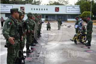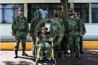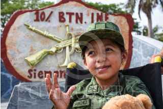 CAMPECHE, 27MAYO2022.- El Décimo Batallón de Infantería llevó a cabo la ceremonia de "Soldado por un Día", donde la niña Irma Isabella Sánchez Orbe de 9 años y que padece hipomelanosis de Ito o incontinentia pigmenti, cumplió su sueño de ser soldado y fue nombrada como soldado honorario. Vestida con la indumentaria militar y acompañada por sus padres y militares, presenció el pase de lista, honores a la bandera y el recorrido por las instalaciones del cuartel militar. FOTO: MICHAEL BALAM/CUARTOSCURO.COM