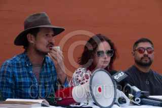 CIUDAD DE MÉXICO, 28MAYP2022.- Sergio González Juarica, vecino de la colonia Juárez; Daniel Ramírez Nava, locatario del Mercado Juárez, el artista Sego (cuyo mural fue borrado de la facha del mercado); Irma Macedo, directora de Central de Muros, Mary Gloria, activista, gestora cultura y vecina de la colonia Guerrero, ofrecieron conferencia de prensa en las inmediaciones del mercado Juárez para pronunciarse ante los actos de borrar murales y rótulos en la alcaldía Cuauhtémoc. Mencionaron que la acción de borrar el mural atentó los derechos de autor del artista y niega el acceso a la cultura para la ciudadanía. FOTO: GALO CAÑAS/CUARTOSCURO.COM