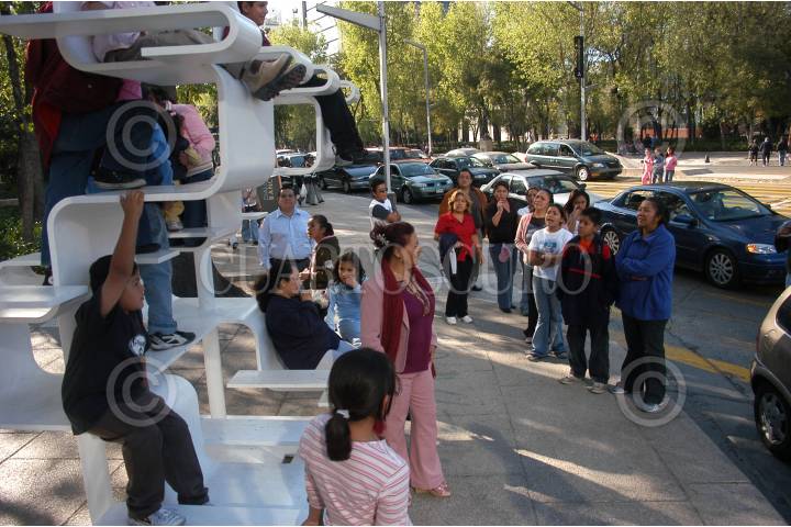 MÉXICO D.F. 25DICIEMBRE2006.- Aprovechando el día, festivo la gente recorre la avenida Reforma y aprovecha para descansar en las bancas de la exposición "Dialogo de Bancas" que se encuentra en esta avenida. En la imagen niños juegan sobre una de las bancas de la exposición. FOTO: GUILLERMO PEREA/CUARTOSCURO.COM
