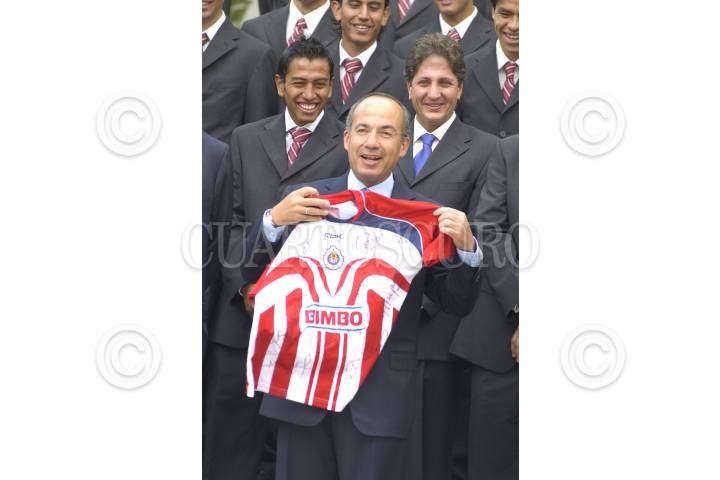 MÉXICO, D.F. 03ENERO2007.- Felipe Calderón Hinojosa, primer mandatario mexicano, Oswaldo Sánchez, exjugador de Chivas del Guadalajara y Ramón Morales, jugador de las Chivas del Guadalajara, durante la fotografía oficial del equipo campeón del Torneo de Apertura 2006 a la Residencia Oficial de Los Pinos. FOTO: IVÁN STEPHENS/CUARTOSCURO.COM