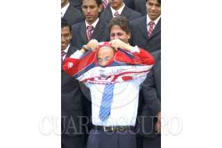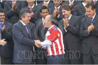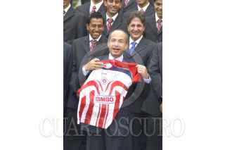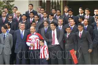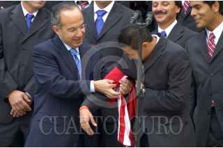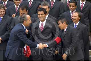 MÉXICO, D.F. 03ENERO2007.- Felipe Calderón Hinojosa, primer mandatario mexicano, Oswaldo Sánchez, exjugador de Chivas del Guadalajara y Ramón Morales, jugador de las Chivas del Guadalajara, durante la fotografía oficial del equipo campeón del Torneo de Apertura 2006 a la Residencia Oficial de Los Pinos. FOTO: IVÁN STEPHENS/CUARTOSCURO.COM