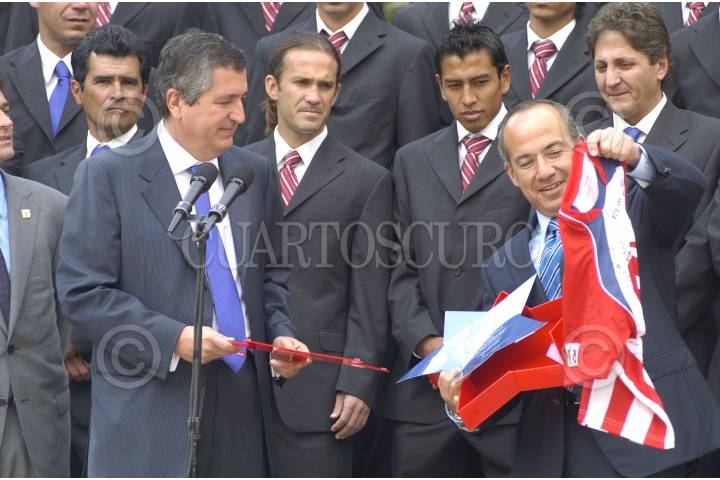 MÉXICO, D.F. 03ENERO2007.- Felipe Calderón Hinojosa, primer mandatario mexicano, Oswaldo Sánchez, exjugador de Chivas del Guadalajara y Ramón Morales, jugador de las Chivas del Guadalajara, durante la fotografía oficial del equipo campeón del Torneo de Apertura 2006 a la Residencia Oficial de Los Pinos. FOTO: IVÁN STEPHENS/CUARTOSCURO.COM