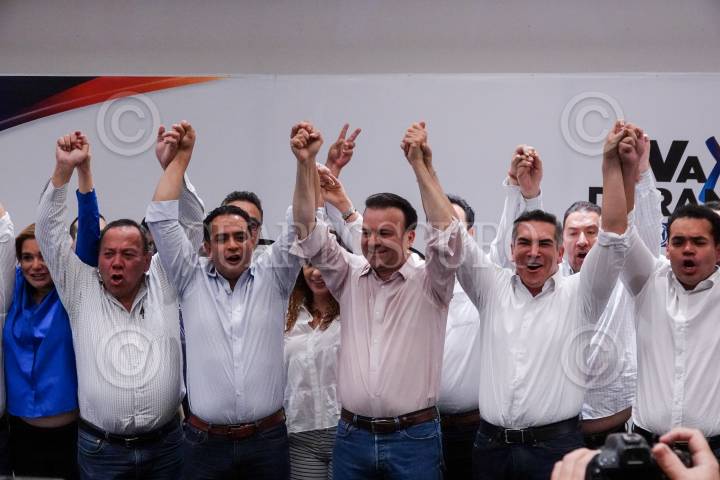 VICTORIA DE DURANGO, DURANGO, 05JUNIO2022.- En conferencia de prensa en un hotel del centro de la entidad, el presidente Nacional del Partido Revolucionario Institucional (PRI), Alejandro Moreno Cárdes; Jesús Zambrano, presidente nacional del Partido de la Revolución Democrática (PRD); María Eugenia Campos, gobernadora de Chihuahua en representación de Marko Cortés, y Esteban Villegas, candidato a la gubernatura de Durango, se proclamaron ganadores de la gubernatura de la entidad, esto tras revisar las encuestas de salida que los posicionan 15 puntos arriba de la candidata de Morena, Marina Vitela. Sin embargo, fue vía twitter que el consejero del Instituto Nacional Electoral (INE), Ciro Murayama, refutó esto diciendo que nadie podía declarase ganador sin haber terminado los conteos preliminares. FOTO: GALO CAÑAS/CUARTOSCURO.COM