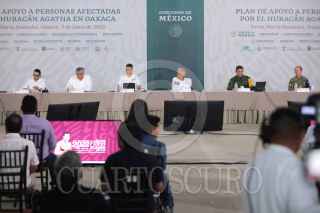 SANTA MARÍA HUATULCO, OAXACA, 09JUNIO2022.- Andrés Manuel López Obrador, Presidente Constitucional de los Estados Unidos Mexicanos, presidió el Plan de Apoyo a las personas afectadas por el Huracán Agatha en Oaxaca. Lo acompañan Germán Arturo Martínez Santoyo, director general de la Comisión Nacional del Agua; Laura Velázquez Alzúa, coordinadora nacional de Protección Civil; Jorge Arganis Díaz Leal, secretario de Infraestructura, Comunicaciones y Transportes; Rosa Icela Rodríguez Velázquez, secretaria de Seguridad y Protección Ciudadana; Adán Augusto López Hernández, secretario de Gobernación; Alejandro Murat Hinojosa, gobernador Constitucional del Estado de Oaxaca; Luis Cresencio Sandoval González, secretario de la Defensa Nacional; José Rafael Ojeda Durán, secretario de Marina; Ariadna Montiel Reyes, secretaria de Bienestar. FOTO: PRESIDENCIA/CUARTOSCURO.COM