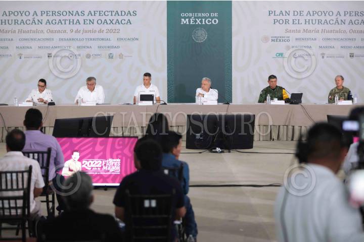 SANTA MARÍA HUATULCO, OAXACA, 09JUNIO2022.- Andrés Manuel López Obrador, Presidente Constitucional de los Estados Unidos Mexicanos, presidió el Plan de Apoyo a las personas afectadas por el Huracán Agatha en Oaxaca. Lo acompañan Germán Arturo Martínez Santoyo, director general de la Comisión Nacional del Agua; Laura Velázquez Alzúa, coordinadora nacional de Protección Civil; Jorge Arganis Díaz Leal, secretario de Infraestructura, Comunicaciones y Transportes; Rosa Icela Rodríguez Velázquez, secretaria de Seguridad y Protección Ciudadana; Adán Augusto López Hernández, secretario de Gobernación; Alejandro Murat Hinojosa, gobernador Constitucional del Estado de Oaxaca; Luis Cresencio Sandoval González, secretario de la Defensa Nacional; José Rafael Ojeda Durán, secretario de Marina; Ariadna Montiel Reyes, secretaria de Bienestar. FOTO: PRESIDENCIA/CUARTOSCURO.COM