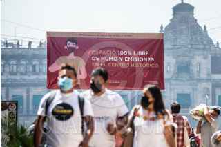 CIUDAD DE MÉXICO, 10JUNIO2022.- En distintas calles del zócalo capitalino fueron colocadas mantas para informar a los transeúntes la nueva medida de espacios libres de humo en el centro histórico. FOTO: MARIO JASSO/ CUARTOSCURO.COM