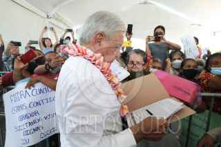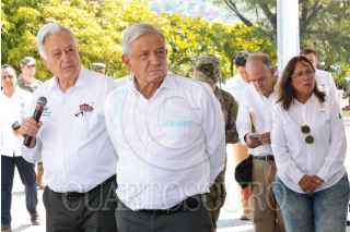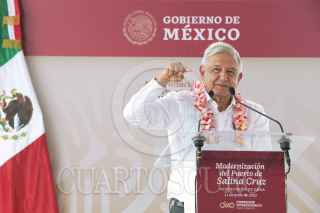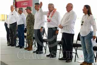 SALINA CRUZ, 11JUNIO2022.- Andrés Manuel López Obrador, presidente de México, presidió la presentación del proyecto de "Modernización del Puerto de Salina Cruz" en las instalaciones de la Administración del Sistema Portuario Nacional de Salina Cruz, Oaxaca. Lo acompañaron: David Ricardo Cervantes Peredo, Subsecretario de Ordenamiento Territorial de la Secretaría de Desarrollo Agrario, Territorial y Urbano; Manuel Bartlett Díaz, director general de la Comisión Federal de Electricidad; Roberto Salcedo Aquino, secretario de la Función Pública; José Rafael Ojeda Durán, secretario de Marina; Alejandro Murat Hinojosa, gobernador Constitucional del Estado de Oaxaca; Rafael Marín Mollinedo, director general del Corredor Interoceánico del Istmo de Tehuantepec; Rocío Nahle García, secretaria de Energía; Octavio Romero Oropeza, director general de Petróleos Mexicanos; Juan Pablo de Botton Falcón, subsecretario de Egresos de la Secretaría de Hacienda y Crédito Público; Herman Deutsch Espino, titular de la Unidad de Infraestructura y Trasportes del Corredor Interoceánico del Istmo de Tehuantepec y Raúl Huerta Martínez, director general de ASIPONA Salina Cruz. FOTO: PRESIDENCIA/CUARTOSCURO.COM