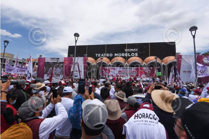 TOLUCA, ESTADO DE MÉXICO, 12JUNIO2022.- Este domingo MORENA llevó a cabo el evento “Unidad y Movilización para que siga la Transformación” con la participación de las llamadas “corcholatas” para el 2023 y 2024, desde las figuras que buscarán suceder a AMLO como Claudia Sheinbaum, Jefa de Gobierno de la CDMX, Marcelo Ebrard, Secretario de Relaciones Exteriores, Adán Augusto López, Secretario de Gobernación y los posibles candidatos para competir por la gubernatura del Estado de México, Higinio Martínez, Senador, Delfina Gómez, Secretaría se Educación Publica y Horacio Duarte, titular de la Agencia Nacional de Aduanas de México (ANAM); el evento se llevó a cabo en la explanada del Teatro Morelos y estuvo encabezado por Mario Delgado Presidente de MOREMA, en donde la militancia inicia los preparativos para las elecciones del 2023 y 2024. FOTO: CRISANTA ESPINOSA AGUILAR /CUARTOSCURO.COM