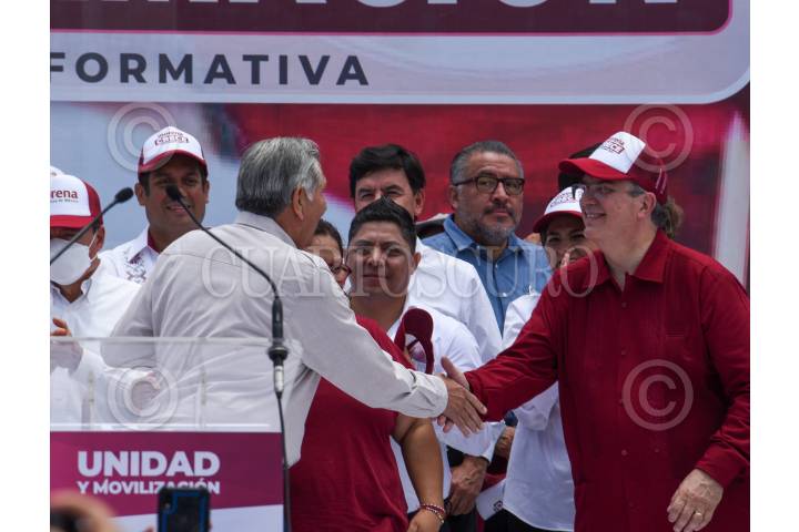 TOLUCA, ESTADO DE MÉXICO, 12JUNIO2022.- Este domingo MORENA llevó a cabo el evento “Unidad y Movilización para que siga la Transformación” con la participación de las llamadas “corcholatas” para el 2023 y 2024, desde las figuras que buscarán suceder a AMLO como Claudia Sheinbaum, Jefa de Gobierno de la CDMX, Marcelo Ebrard, Secretario de Relaciones Exteriores, Adán Augusto López, Secretario de Gobernación y los posibles candidatos para competir por la gubernatura del Estado de México, Higinio Martínez, Senador, Delfina Gómez, Secretaría se Educación Publica y Horacio Duarte, titular de la Agencia Nacional de Aduanas de México (ANAM); el evento se llevó a cabo en la explanada del Teatro Morelos y estuvo encabezado por Mario Delgado Presidente de MOREMA, en donde la militancia inicia los preparativos para las elecciones del 2023 y 2024. FOTO: CRISANTA ESPINOSA AGUILAR /CUARTOSCURO.COM