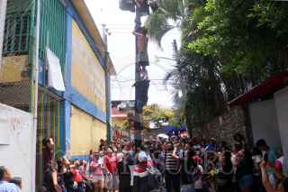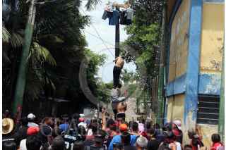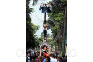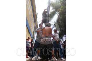 CUERNAVACA, MORELOS, 13JUNIO2022.- Durante la fiesta patronal de San Antonio de Padua jóvenes intentan alcanzar los regalos que se encuentran en la punta del palo encebado, un juego popular en extinción. FOTO: MARGARITO PÉREZ RETANA / CUARTOSCURO.COM