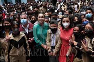 CIUDAD DE MÉXICO, 14JUNIO2022.- Claudia Sheinbaum, jefa de Gobierno; Luis Humberto Fernández, titular de la Autoridad Educativa Federal en la Ciudad de México; José Antonio Peña Medina, titular de la Agencia Digital e Innovación Pública de la Ciudad de México, y Yahaira Gamiochipi, directora de la Escuela Secundaria Técnica #63 “Melchor Ocampo”, encabezaron una visita en esta escuela para informar que se contará con antenas para que haya internet gratuito. FOTO: GRACIELA LÓPEZ /CUARTOSCURO.COM