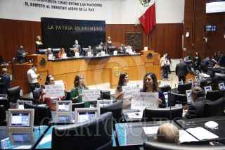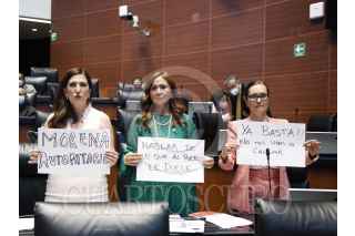 CIUDAD DE MÉXICO, 15JUNIO2022.- Legisladoras panistas, entre ellas Kenia López Rabadán, se manifestaron en la sesión de la Comisión Permanente en contra de lo que calificaron como autoritarismo de Morena. FOTO: CUARTOSCURO.COM