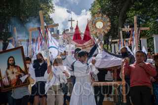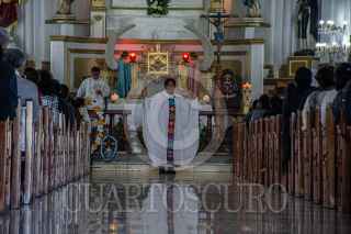 SAN CRISTÓBAL DE LAS CASAS, CHIAPAS, 16JUNIO2022.- En el marco de la celebración del Cuerpo de Cristo de la iglesia Católica, el padre Marcelo y la parroquia de la santísima Virgen de Guadalupe llamaron a la población a celebrar una misa y realizar una peregrinación para pedir por La Paz en la región después de que grupos armados se enfrentaran en la calles de este pueblo mágico el día 14 de junio. FOTO: ISABEL MATEOS /CUARTOSCURO.COM