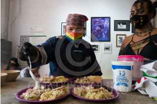CIUDAD DE MÉXICO, 16JUNIO2022.- El Comedor Comunitario, Foro Cultural y Galería de Arte LGBTTTIQ+ "Manos Amigues", está integrado por personas de la comunidad que pertenecen a una Asociación Civil con el mismo nombre; el proyecto surgió durante la pandemia por Brent Alberghini, pesidente de la A.C "Manos Amigues", para entregar despensas a personas que se habían quedado sin trabajo o necesitaban ayuda y hace once meses abrió el local para el comedor comunitario. Actualmente se sirven 250 comidas con un costo de once pesos cada una y el servicio para llevar cada cliente debe llevar sus propios tuppers. El horario es de lunes a viernes de 13 a 16 horas en la calle de Pedro Moreno 113, colonia Guerrero. FOTO: GRACIELALÓPEZ /CUARTOSCURO.COM