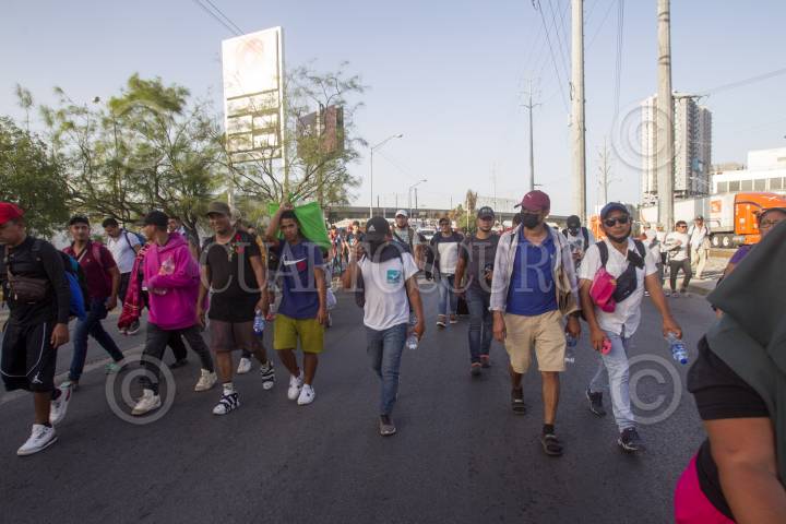 MONTERREY, NUEVO LEÓN, 16JUNIO2022.- Cientos de migrantes que habían quedado varados en la central de autobuses de Monterrey, emprendieron una marcha hacia Saltillo, Coahuila, escoltados por patrullas de Fuerza Civil con la convicción de llegar a la frontera con Estados Unidos. FOTO: GABRIELA PÉREZ MONTIEL / CUARTOSCURO.COM