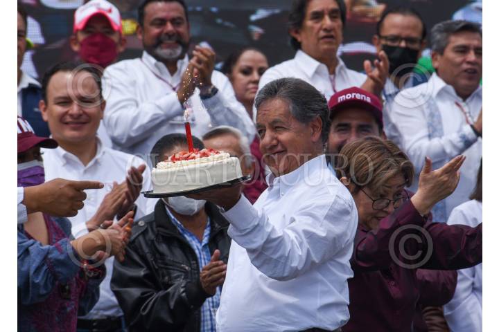 TOLUCA, ESTADO DE MÉXICO, 18JUNIO2022.- Acompañado por alcaldes, diputados locales y federales y Martha Guerrero Delegada de la 4T en el Estado de México, el Senador Higinio Martínez encabezó la movilización “Mexiquenses de Corazon” en Toluca, quien aspira a ser el candidato de MORENA para la Gubernatura del Estado de México, la asamblea se realizó en la avenida Lerdo de Tejada frente a Palacio de Gobierno, en donde también celebró su cumpleaños mordiendo un pastel. Durante la asamblea advirtieron al gobierno del PRI que vayan preparando las maletas por que pronto se irán. FOTO: CRISANTA ESPINOSA AGUILAR /CUARTOSCURO.COM
