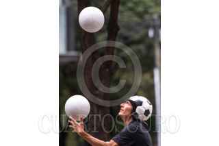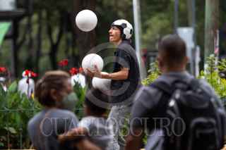 CIUDAD DE MÉXICO, 19JUNIO2022.-Un joven se gana la vida en la calle de Sonora en donde realiza malabares con tres balones. FOTO: MOISÉS PABLO/CUARTOSCURO.COM