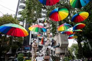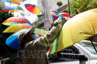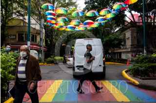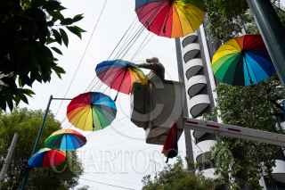 CIUDAD DE MÉXICO, 22JUNIO2022.- Trabajadores de la Ciudad de México continuaron la instalación de sombrillas y pinta de cruces peatonales con la conocida bandera de la comunidad LGBTTTIQPA+ para conmemorar el mes del orgullo por la diversidad sexual. El próximo sábado 25 será cuando colectivos y personas integrantes de la comunidad marchen para conmemorar el inicio de la lucha por sus derechos y la erradicación de la discriminación. FOTO: GALO CAÑAS/CUARTOSCURO.COM
