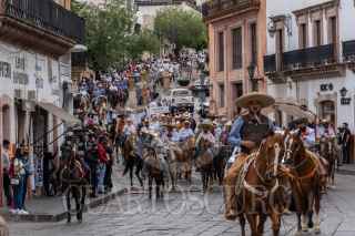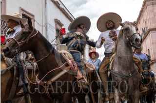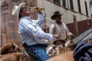 ZACATECAS, ZACATECAS, 26JUNIO2022.- Con la compañía de tamborazo, cerveza, tequila y mezcal, decenas de personas participaron en la tradicional cabalgata con motivo de los festejos del aniversario de la Toma de Zacatecas realizada por las principales calles del centro histórico, para arribar a la explanada del cerro de la bufa. FOTO: DIANA VALDEZ/ CUARTOSCURO.COM
