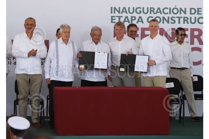 PARAÍSO, TABASCO, 01JULIO2022. El presidente Andrés Manuel López Obrador inaugura la primera etapa constructiva de la refinería “Olmeca” Dos Bocas donde también ofreció un mensaje a la nación con motivo del cuarto aniversario de su triunfo en las urnas que le otorgó el mando del poder ejecutivo. Acompañado de gobernadores y secretarios de estado como invitados especiales se dio paso a la ceremonia de apertura de las instalaciones. FOTO: EDGAR NEGRETE/CUARTOSCURO.COM