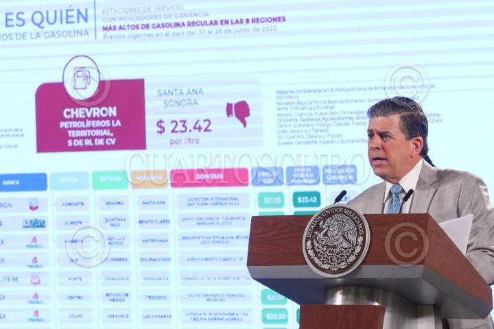CIUDAD DE MÉXICO, 04JULIO2022.- Andrés Manuel López Obrador, Presidente de México; Ricardo Sheffield Padilla, director de Profeco; Raquel Buenrostro, Jefa del SAT, y Antonio Martínez Dagnino, administrador general de grandes contribuyentes del SAT, durante la conferencia de prensa en Palacio Nacional. FOTO: MOISÉS PABLO/CUARTOSCURO.COM