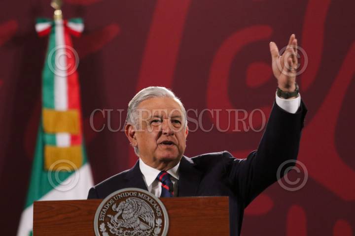 CIUDAD DE MÉXICO, 04JULIO2022.- Andrés Manuel López Obrador, Presidente de México; Ricardo Sheffield Padilla, director de Profeco; Raquel Buenrostro, Jefa del SAT, y Antonio Martínez Dagnino, administrador general de grandes contribuyentes del SAT, durante la conferencia de prensa en Palacio Nacional. FOTO: MOISÉS PABLO/CUARTOSCURO.COM