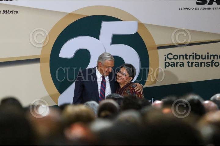 CIUDAD DE MÉXICO, 04JULIO2022.- Andrés Manuel López Obrador, Presidente de México, y Raque Buenrostro, Jefa del Sistema de Administración Tributaria (SAT), encabezaron los 25 años de este organismo de la Secretaría de Hacienda y Crédito Público, en la Biblioteca Antonio Ortiz Mena, en Palacio Nacional. FOTO: MOISÉS PABLO/CUARTOSCURO.COM