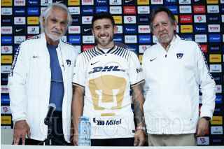 CIUDAD DE MÉXICO, 05JULIO2022.- El atacante argentino Eduardo Salvio, quien portará el ‘10’ auriazul, fue presentado ante los medios de comunicación por la directiva del Club Universidad, que encabezan el presidente Leopoldo Silva y el vicepresidente deportivo, Miguel Mejía Barón. FOTO: CLUB PUMAS/CUARTOSCURO.COM