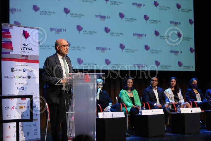 CIUDAD DE MÉXICO, 06DEJULIO2022.- Conferencia de prensa del Hay Festival Querétaro, festival cultural de ideas para todos los públicos que celebra las artes y las ciencias a través de eventos inclusivos, accesibles y lúdicos. Al evento asistieron el embajador de España, Juan López-Dóriga Pérez; el embajador del Reino Unido en México, Jon Benjamin; la directora internacional del Hay Festival, Cristina Fuentes La Roche y el presidente municipal de Querétaro, Luis Bernardo Nava entre otros invitados, en el Centro Cultural España. FOTO: EDGAR NEGRETE/CUARTOSCURO.COM