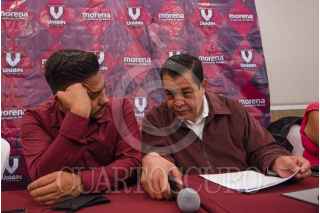 TOLUCA, ESTADO DE MÉXICO, 07JULIO2022.- Juan Hugo de la Rosa y Adolfo Cerqueda Rebollo, presidente municipal de Nezahualcóyotl anunciaron que buscarán la nominación de MORENA a la gubernatura del Estado de México, esto a unas horas de haber sido publicada la convocatoria de este partido político para definir el coordinador de los comités de defensa de la Cuarta Transformación. FOTO: CRISANTA ESPINOSA AGUILAR /CUARTOSCURO.COM