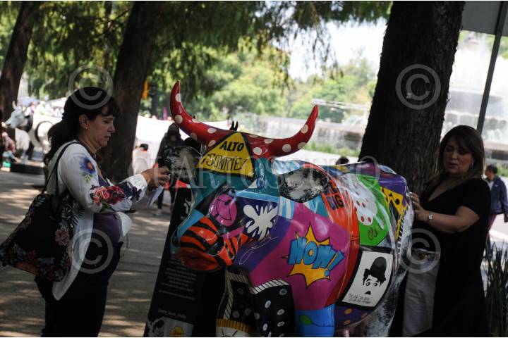 CIUDAD DE MÉXICO, 10JULIO2022.- Luego de 17 fuera del país, la CowParade volverá a ser expuesta sobre la Av. Paseo de la Reforma, donde decenas de figuras de vacas fueron intervenidas por artistas plásticos. Desde esta mañana, las personas que transitan por dicha avenida se toman fotografías junto a las figuras que permanecerán hasta agosto de este año. FOTO: DANIEL AUGUSTO /CUARTOSCURO.COM
